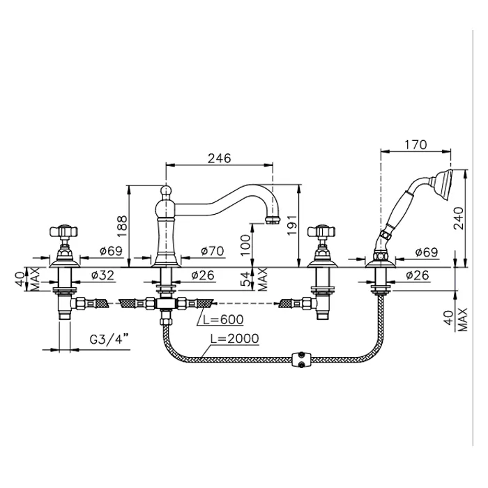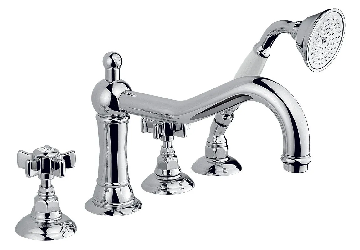 Nicolazzi Half Dome 1449CR70 - смеситель для ванны на 4 отверстия, с донным клапаном, с изливом: длина - 24,6 см, высота - 10 см, ручным душем и вытяжным шлангом в комплекте, цвет - хром.