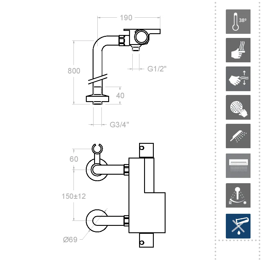 Изготовленный из хромированной латуни, данный смеситель имеет защитное покрытие с никелем толщиной 15 микрон и хромом в 0.3 микрона, обеспечивающее долговечность и блеск. Благодаря системе Termostop, температура горячей воды ограничена до безопасных 38 °C.