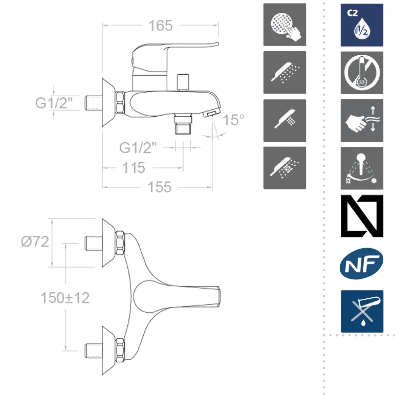 Смеситель Ramonsoler Ypsilon разработан для работы при давлении от 1 до 5 бар (рекомендуется 3 бара) и выдерживает гидравлический удар до 25 бар. Оптимальная температура горячей воды составляет 55°С, хотя максимальная температура использования может достигать 65°С (при необходимости, в течение одного часа допустимо до 90°С).