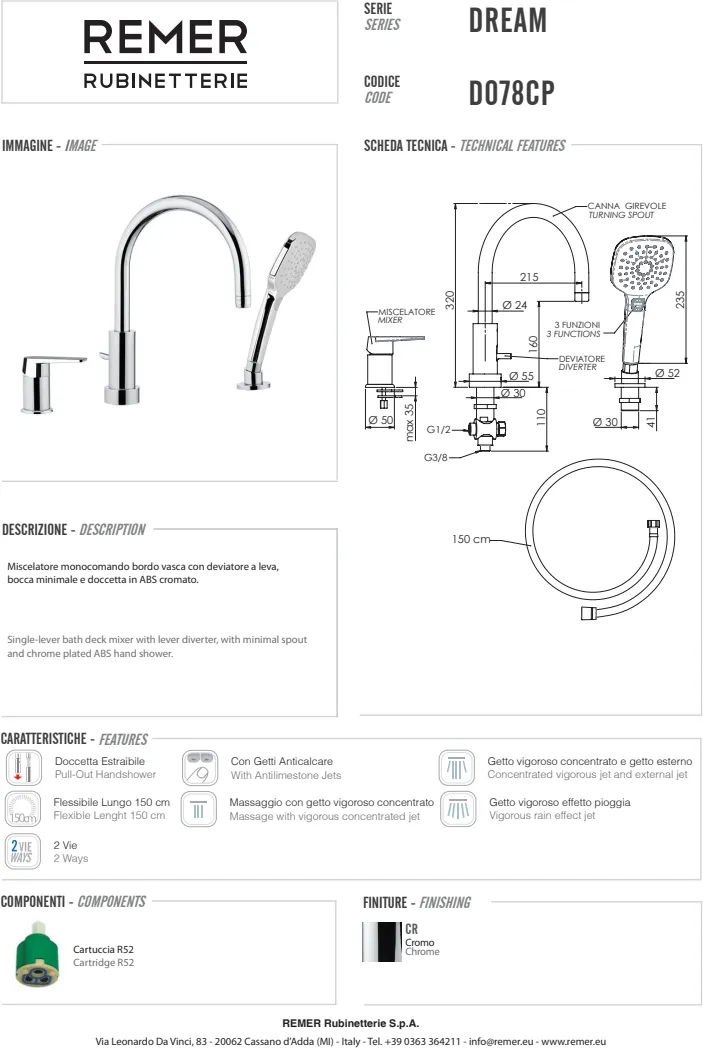 Смеситель для ванны Remer Dream набортный хром D078CP