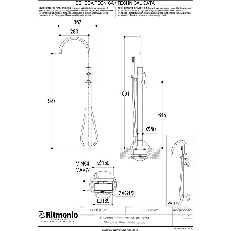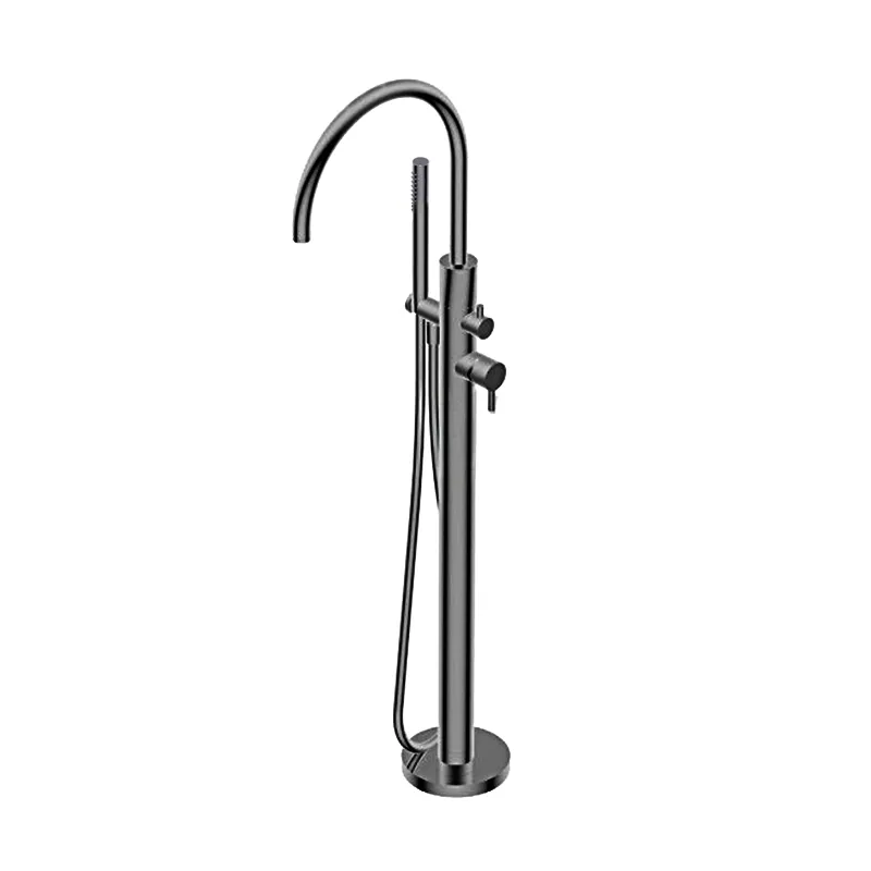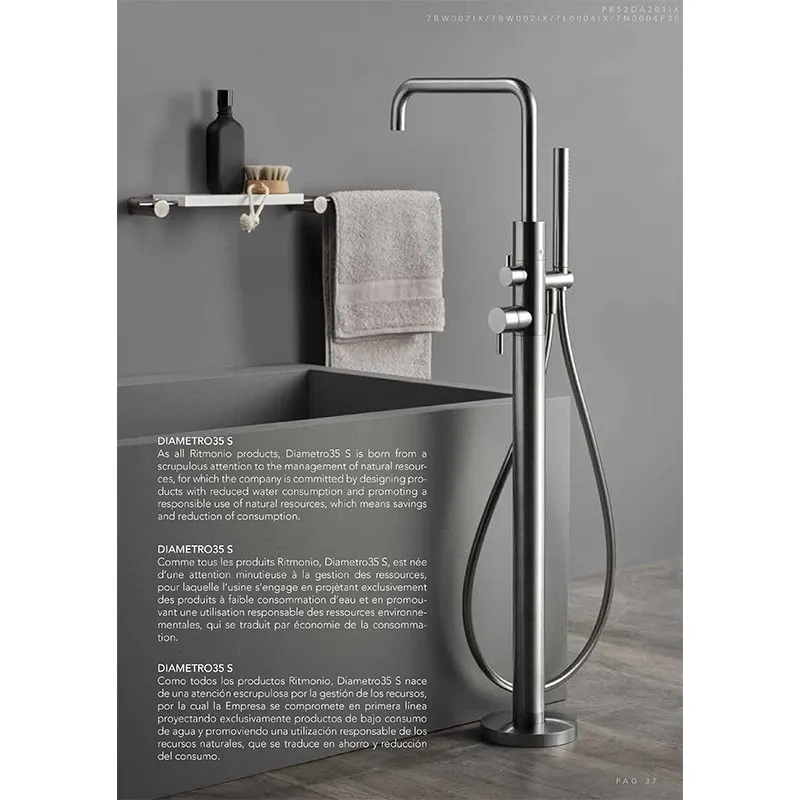 Напольный смеситель для ванны Ritmonio Diametro35 S арт. PR52DB202BLX в цвете брашированный чёрный хром — это изысканный и функциональный аксессуар для вашей ванной комнаты. Смеситель включает в себя ручной душ и имеет высоту 1091 мм, с длиной излива 28 см и возможностью регулировки до 927 мм. Для завершения установки требуется приобрести внутреннюю часть PM00801.