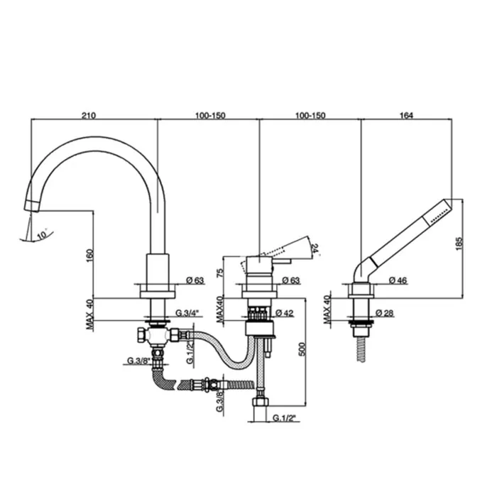 Смеситель на борт ванны Cisal Less New на 3 отв. с ручной лейкой, хром LN00126021