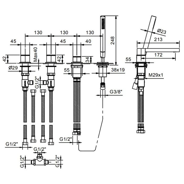 Смеситель на борт ванны Fantini Mint на 2 источника, 4 отв., с ручн душем, без излива, нержавеющая сталь 34 93 F167