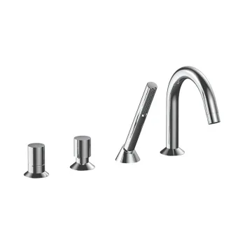 Fantini 50021665 NOSTROMO Набортный смеситель для ванны вылет 19,5 см ручки на 4 отверстия переключатель на 2 потока с кнопкой ручная лейка SUN гибкий шланг 150 см впуски 1/2" подводка N.B. ручной душ FIT отделка PVD - Хром