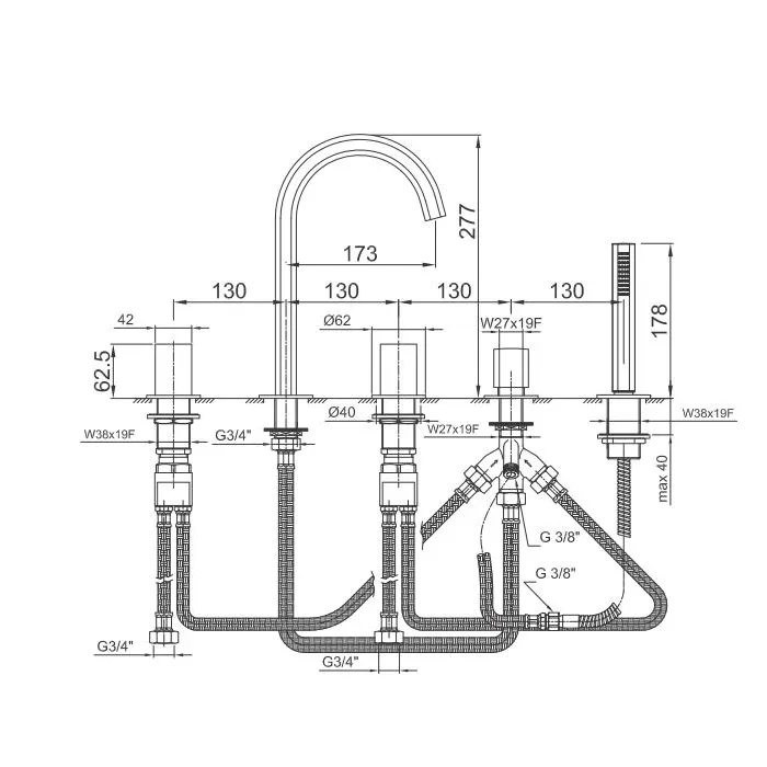 Смеситель на борт ванны Fantini Venezia 5 отв., с ручн душем, излив 175, Matt Copper PVD 29 P9 N465S