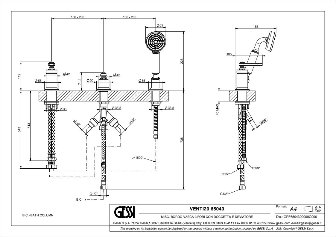 Смеситель на борт ванны Gessi Venti20 65043.710 Brass PVD