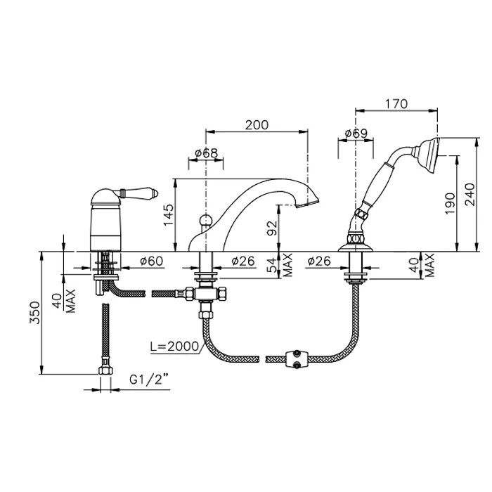Смеситель на борт ванны Nicolazzi Cristallo на 3 отверстия, с изливом 200мм и ручным душем, хром 3414CR33