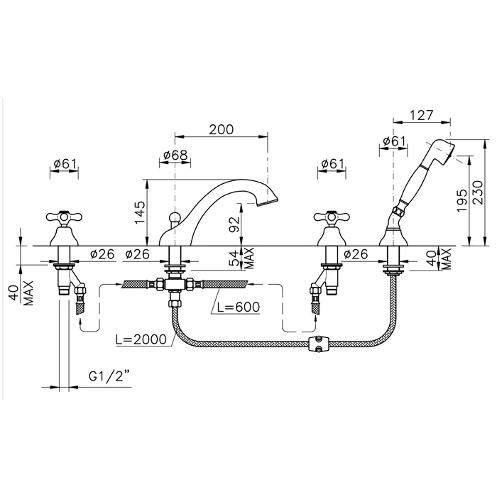 Смеситель на борт ванны Nicolazzi Nuova Brenta на 4 отверстия, с душевой лейкой, излив: 200мм, хром 2504CR