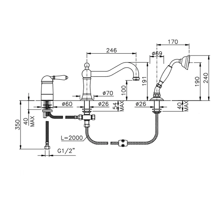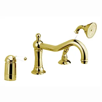 Смеситель на борт ванны Nicolazzi P.M. Blanc на 3 отверстия, с изливом 246мм и ручным душем, ручки белая керамика, english gold 3449GF76