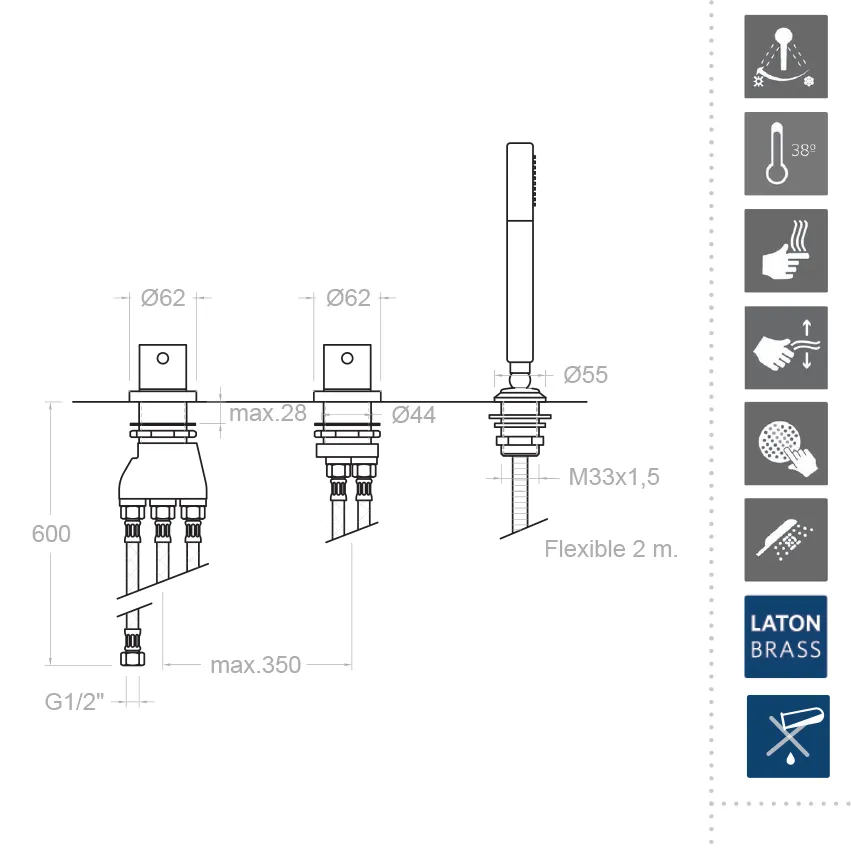 Одной из ключевых особенностей этой модели является термостатический картридж, который позволяет плавно регулировать температуру воды. Благодаря системе Hotblock ваша ванная комната всегда будет безопасной: эта функция предотвращает подачу слишком горячей воды, защищая от ожогов. Блокировка температуры на уровне 38 °C гарантирует, что вы получите оптимальную температуру воды при любом сценарии использования.