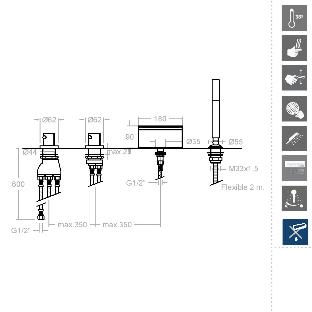 Смеситель на борт ванны Ramonsoler Arola термостатический с каскадным изливом и ручным душем 263304TM