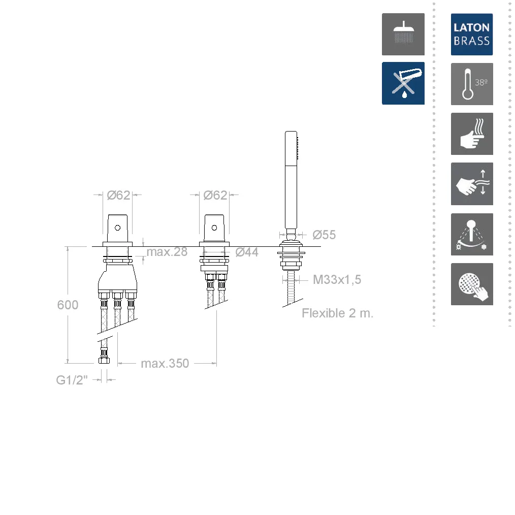 Термостатическое управление с системой HOTBLOCK обеспечивает безопасность и комфорт: функция блокировки контролирует температуру воды, не превышая 38°, защищая вас от ожогов. Эта система автоматически снижает подачу горячей воды при резких перепадах, гарантируя постоянную температуру, что особенно важно при воздействии внешних факторов, таких как работа других сантехнических приборов.