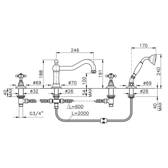 Смеситель на борт ванны с душем Nicolazzi Half Dome Crystal на 4 отверствия, излив: 246 мм, хром 1449CR93