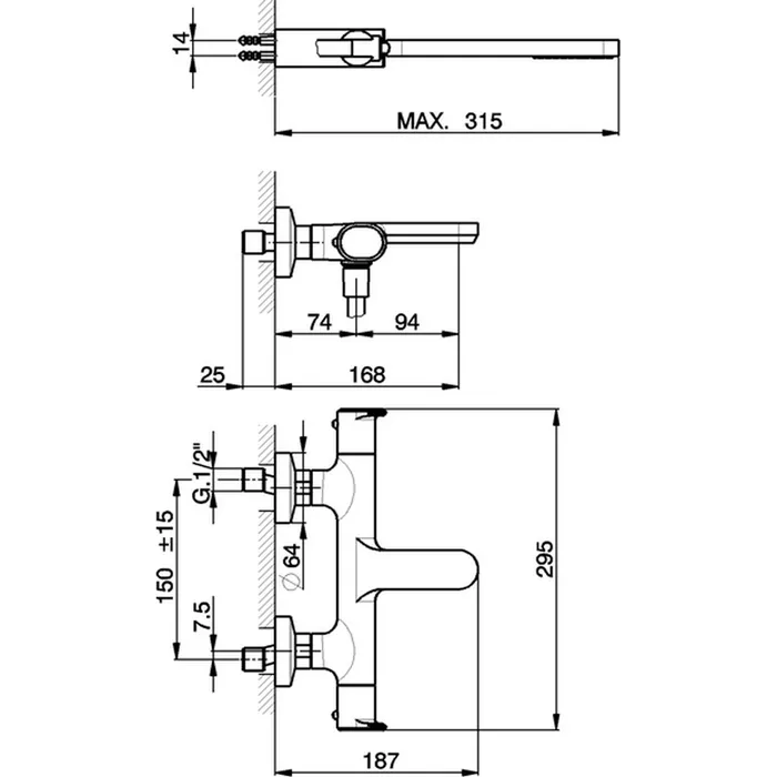 Смеситель термостатический для ванны Cisal Lineaviva настенный, с ручной лейкой,держателем и шлангом, хром LVD2101021