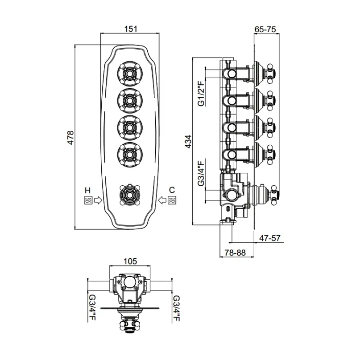 Внешняя часть вертикальная для термостатического смесителя Carimali Colonial с 4-ю независимыми выходами хром 21044EST-CR