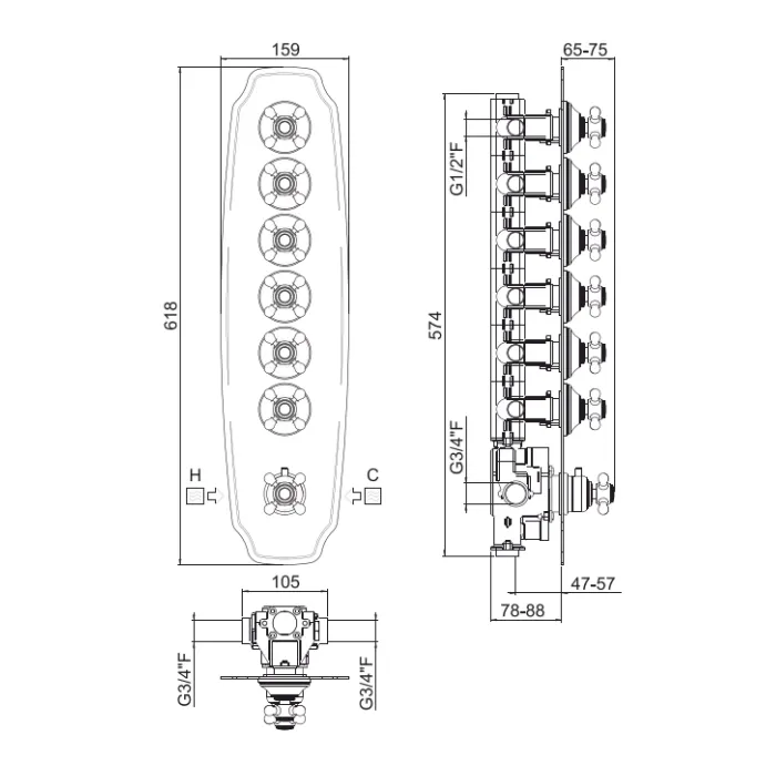 Внешняя часть вертикальная для термостатического смесителя Carimali Colonial с 6-ю независимыми выходами хром 21064EST-CR