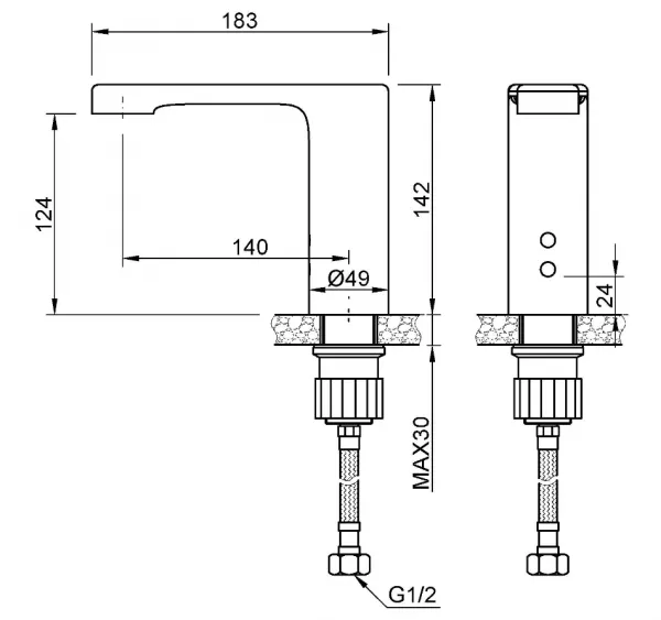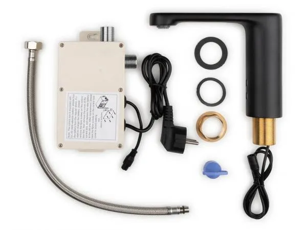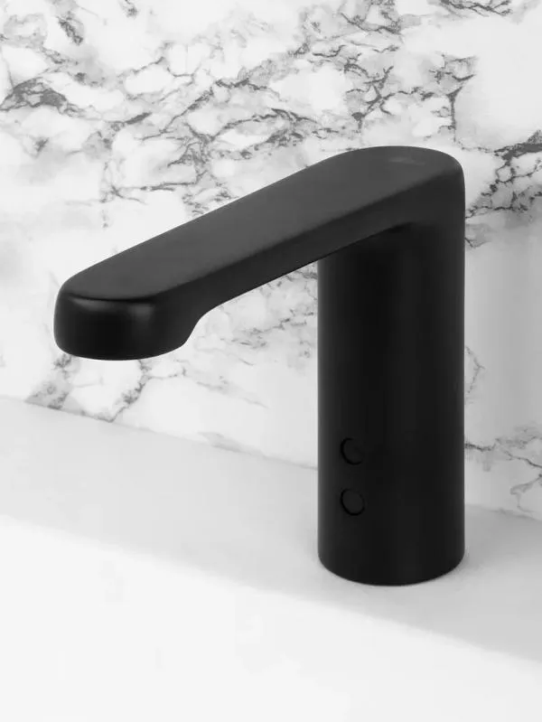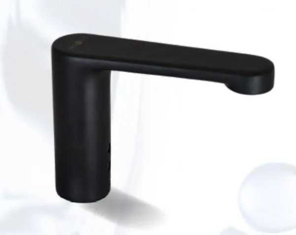 Автоматический водопроводный кран для умывальника черного цвета. Установка на столешницу с автоматической системой активации через встроенный в нее инфракрасный датчик Работа от сети 220 В 50/60 Гц или от 4 батареек АА, обеспечивающих 6 В в случае сбоя питания. Расход 6 л / мин при давлении 3 бара Материал: хромированная латунь CW617N Размеры: 142 высота x 49 ширина x 183 глубина (мм)
