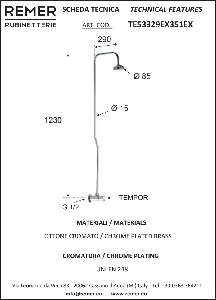 Кран порционный Remer Tempor для душа EX с душевой колонной TE53329EX351 - это стильное и функциональное решение для вашего душа. Оснащён пневматическим краном-таймером, который автоматически закрывается через 15-25 секунд. Это идеально подходит для общественных мест, позволяя экономить воду и рационализировать её использование. Коллекция TEMPOR предлагает изделия с различным дизайном, который подойдёт к любому интерьеру, будь то дизайнерское, современное или традиционное оформление. Этот кран, выполненный из латуни, отличается высокими эксплуатационными характеристиками и долговечностью. Его нажимное управление и классический стиль делают его прекрасным выбором для любого помещения.