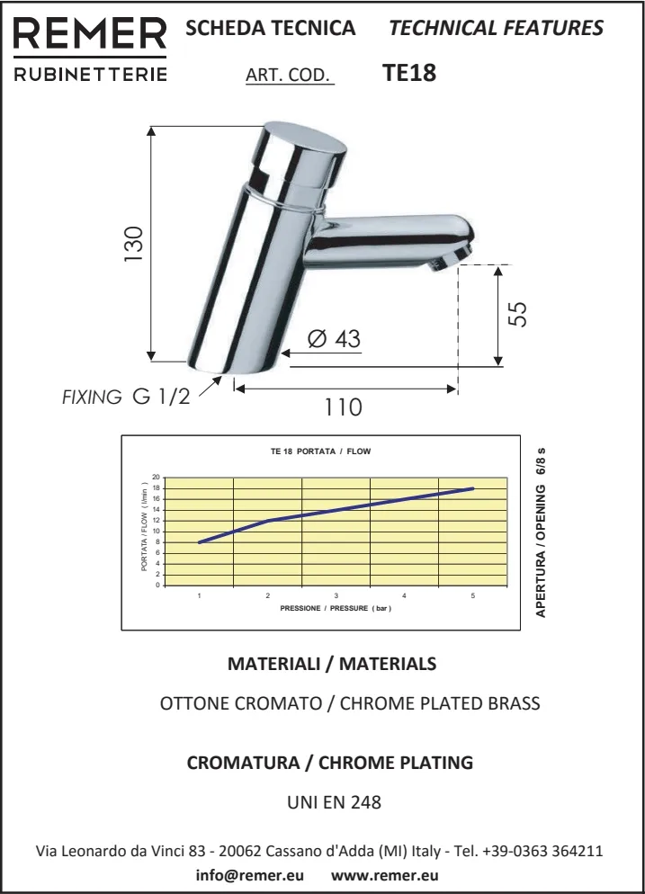 Кран порционный Remer Tempor из коллекции MINIMAL представляет собой идеальное решение для установки в общественных местах. Этот функциональный кран изготовлен из прочной хромированной латуни и оснащен таймером, который автоматически закрывается через 6-8 секунд после нажатия, что способствует экономии воды и более рациональному ее использованию. Дизайн изделия выполнен в классическом стиле с округлыми формами и хромированной глянцевой поверхностью, гармонично сочетающимися с любым интерьером, будь то современный или традиционный. Краны серии TEMPOR подходят для раковин и устанавливаются нажимным способом на одно монтажное отверстие.