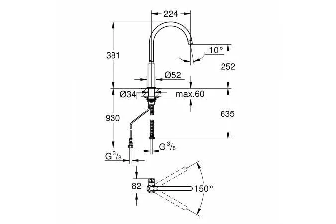 Диапазон поворота 150°.
