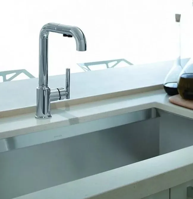 Jacob Delafon Purist 7505D-CP – стильный смеситель для кухни с ультрасовременным дизайном. Высокий излив в виде трубки изогнут под прямым углом. Сбоку на основании модели находится тонкая рукоятка для контроля напора и температуры воды. Смеситель имеет гладкую хромированную поверхность.