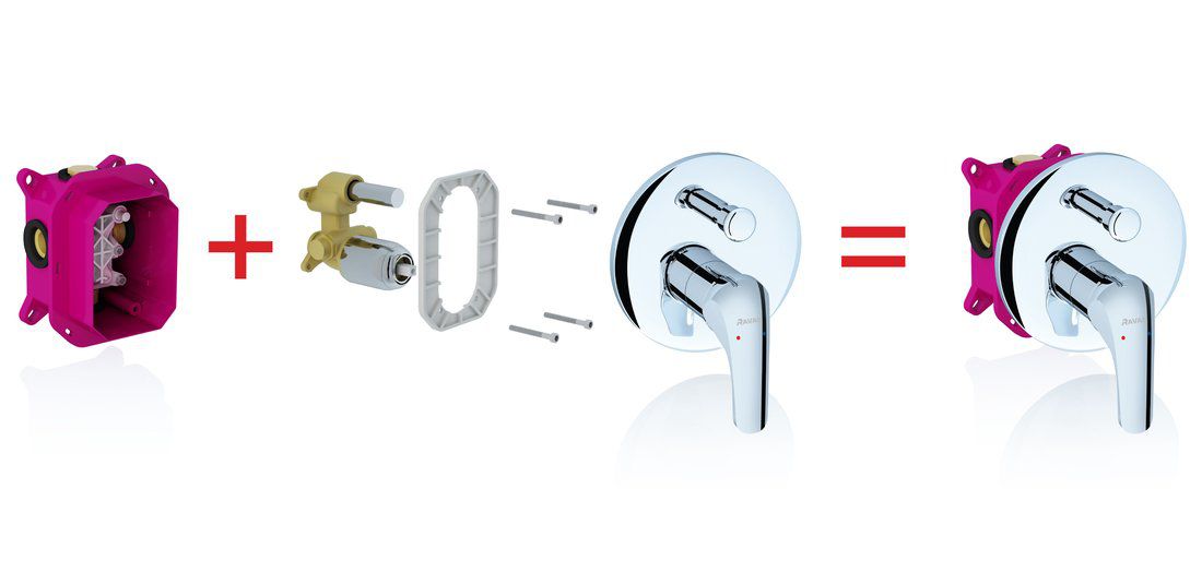 Смеситель скрытого монтажа, изготовленный из латуни (верхняя часть смесителя RS 065.00, RS 066.00) не является составной частью R-box, ее нужно покупать отдельно.