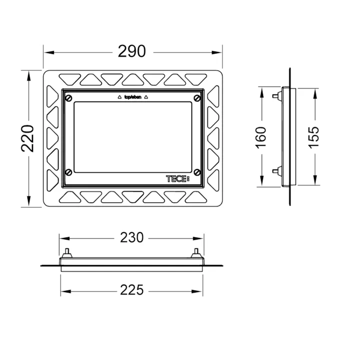 Монтажный комплект для установки панелей смыва унитаза TECEloop (стекло), TECEloop (пластик), TECEvelvet, TECESquare (стекло), TECElux Mini, а также TECE flow на уровне стены. Рамка для облицовки стеновой плиткой с регулированием глубины в диапазоне 5-18 мм (18-33 мм с использованием регулируемых болтов — арт. 9820181). В комплект входит инструмент для монтажа/демонтажа панели смыва.