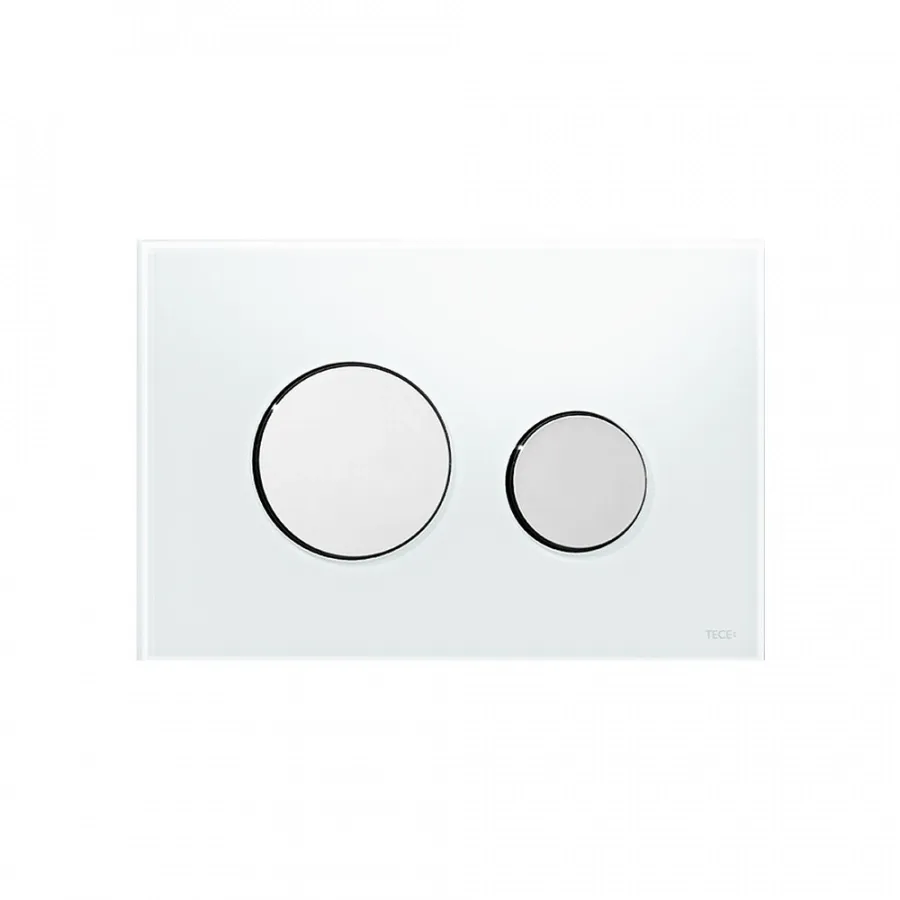 Панель смыва для смывных бачков TECE, фронтальная или верхняя установка. Плоская стеклянная панель смыва с двумя установленными на пружинах клавишами смыва. Подходит для монтажа на уровне стены вместе с монтажной рамкой унитаза (например арт. 9240649).
