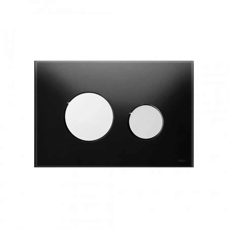 Панель смыва для смывных бачков TECE, фронтальная или верхняя установка. Плоская стеклянная панель смыва с двумя установленными на пружинах клавишами смыва. Подходит для монтажа на уровне стены вместе с монтажной рамкой унитаза (например арт. 9240649).