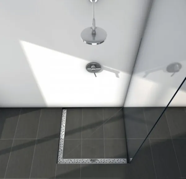 Угловой душевой канал 90° для монтажа в бетонной стяжке с фланцем и гидроизоляционной лентой Seal System для создания протестированного независимой лабораторией соединения душевого канала TECEdrainline с композитной гидроизоляцией.