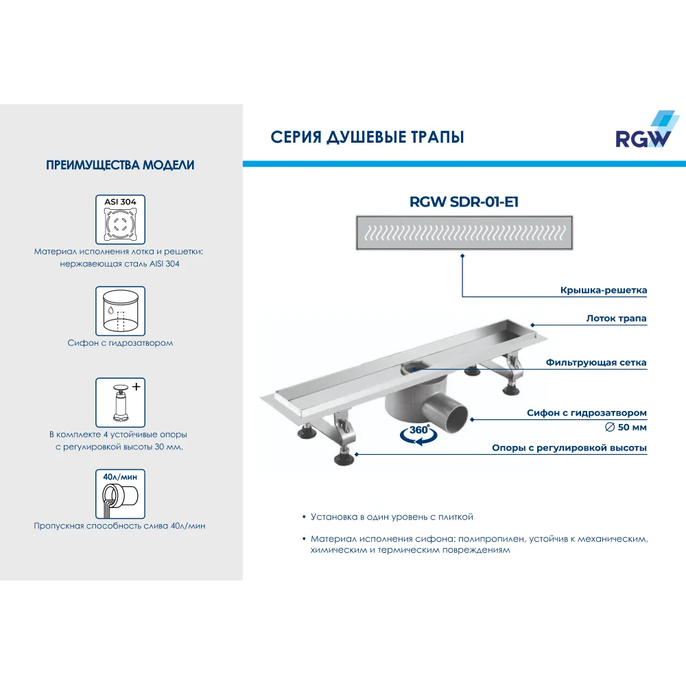 Душевой трап RGW SDR-01 E1 – это сантехническое изделие, созданное для отведения воды из зоны, где находится душевое пространство, выложенное керамической плиткой или мозаикой.