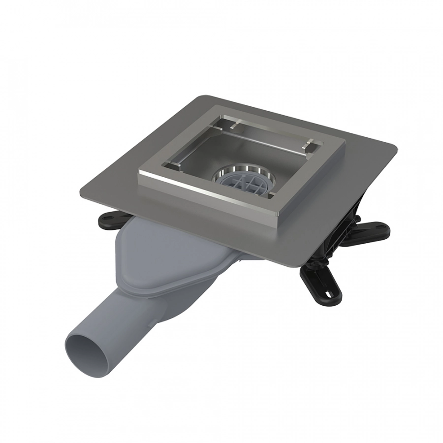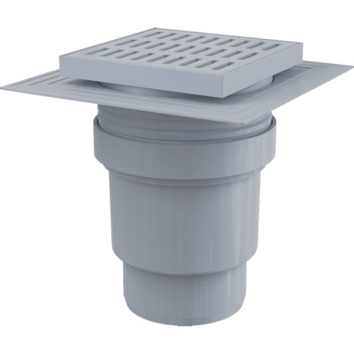 AlcaPlast APV11 Душевой трап | комплект с дизайн-решёткой 150*150 мм (серый). Для ванных комнат и других помещений, где предполагается частый и регулярный сток воды в сливной трап. Для водоотведения на уровне пола. Для безбарьерного доступа. Объемный сливной трап. Пластиковая решетка 145×145×5 мм. Регулируемая по высоте горловина 37–57 мм. Воротник с 2-х уровневой изоляцией для армирования стяжки под плиткой. Прямое подключение к канализационному стоку Ø110 мм. Мокрый гидрозатвор надежно защищает от проникновения запаха из канализации. Материал: полипропилен, устойчивый к механическим, химическим и термическим повреждениям. В комплекте: Корпус сливного трапа с прямым подключением к стоку Ø110 мм; Горловина сливного трапа 150×150 мм; Пластиковая решетка – серая; Мокрый гидрозатвор; Воротник с 2-х уровневой изоляцией, внутреннее отверстие Ø150 мм; Комплект прокладок.