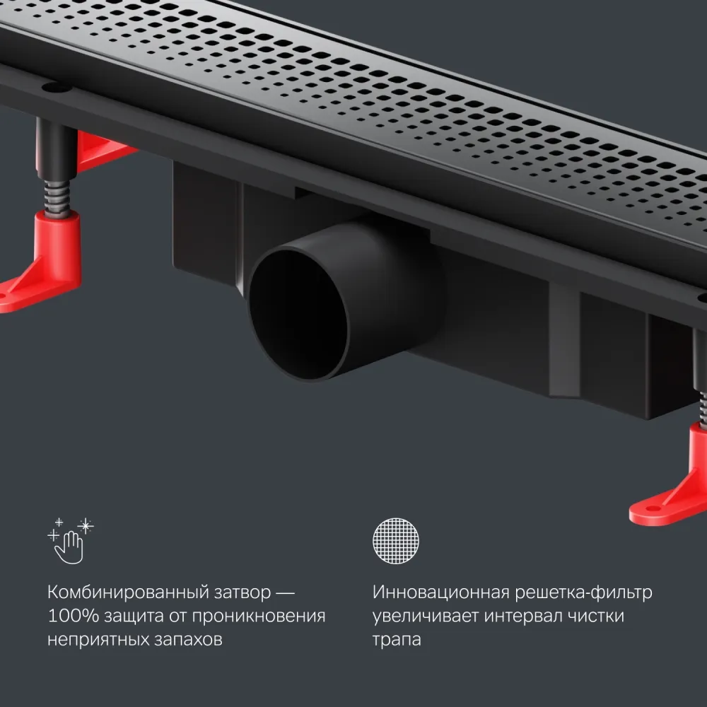 - Дополнительное оснащение: скребок для чистки трапа, решетка-фильтр, регулируемые опоры