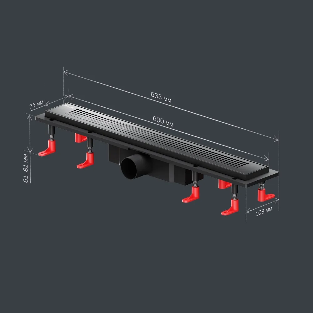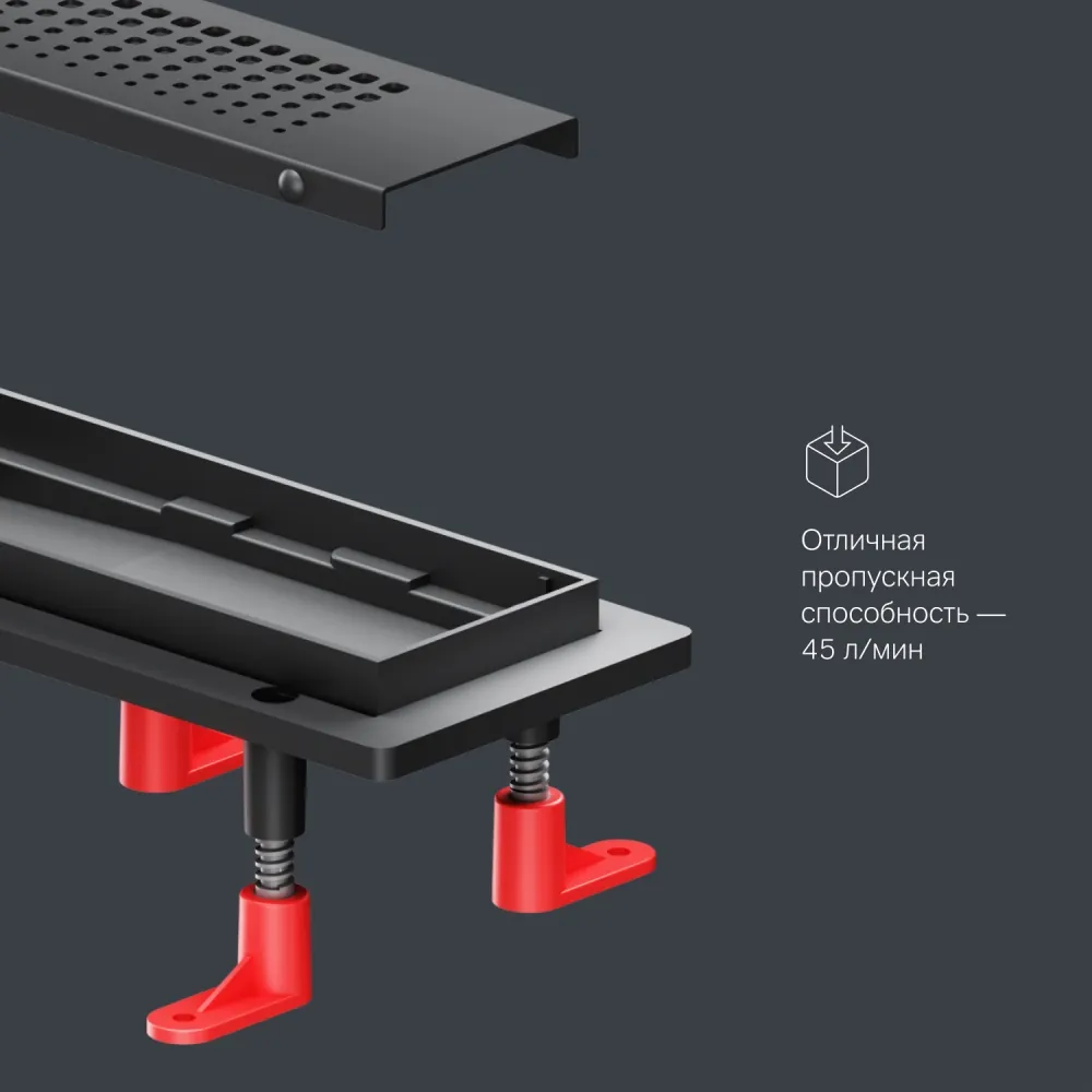 - Дополнительное оснащение: скребок для чистки трапа, решетка-фильтр, регулируемые опоры
