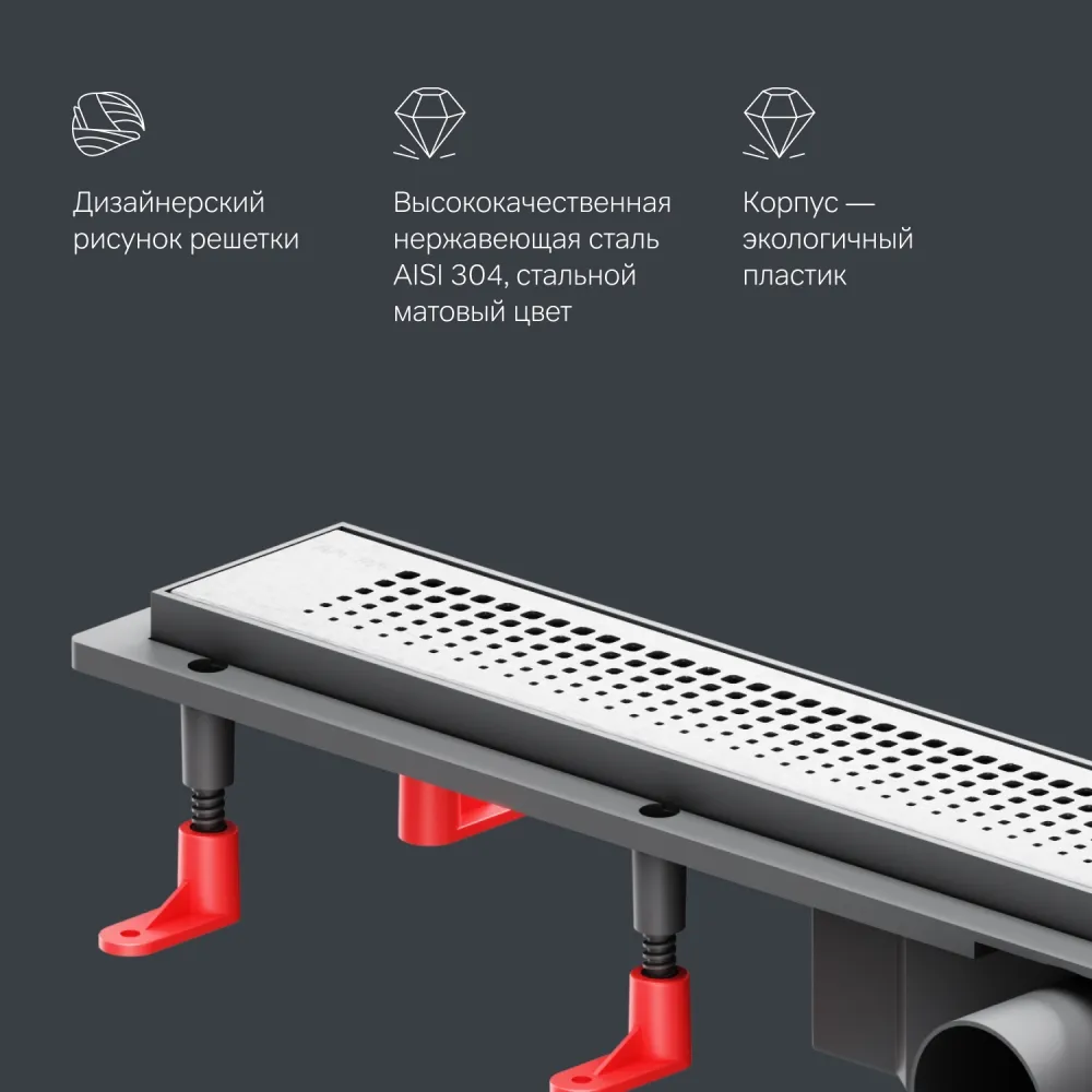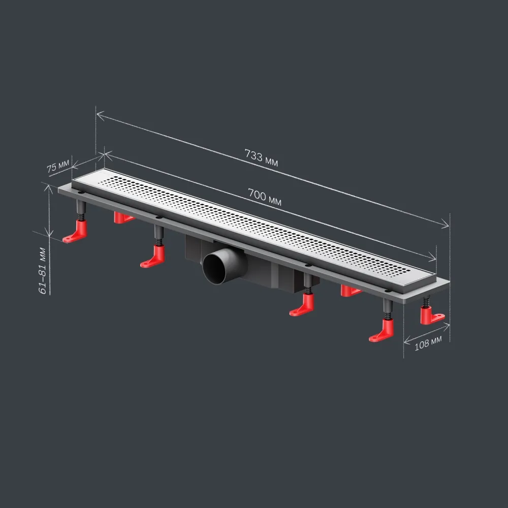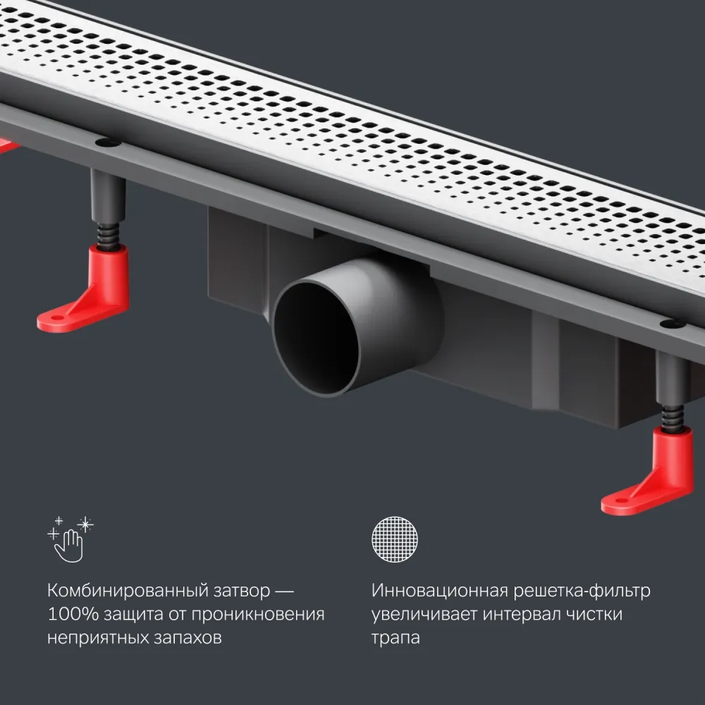 - Дополнительное оснащение: скребок для чистки трапа, решетка-фильтр, регулируемые опоры