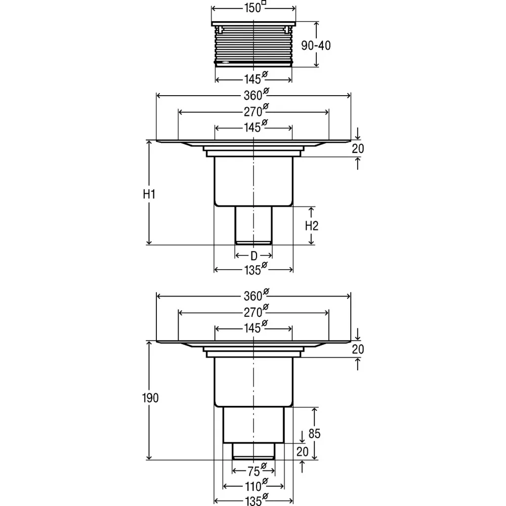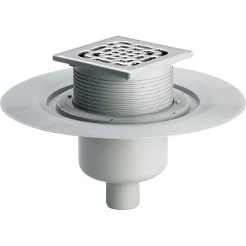 557188 трап с вращающ. и измен. по высоте решеткой из нерж. 150х150мм, вертик.отвод, 1,5 л/сек, пласт/серый