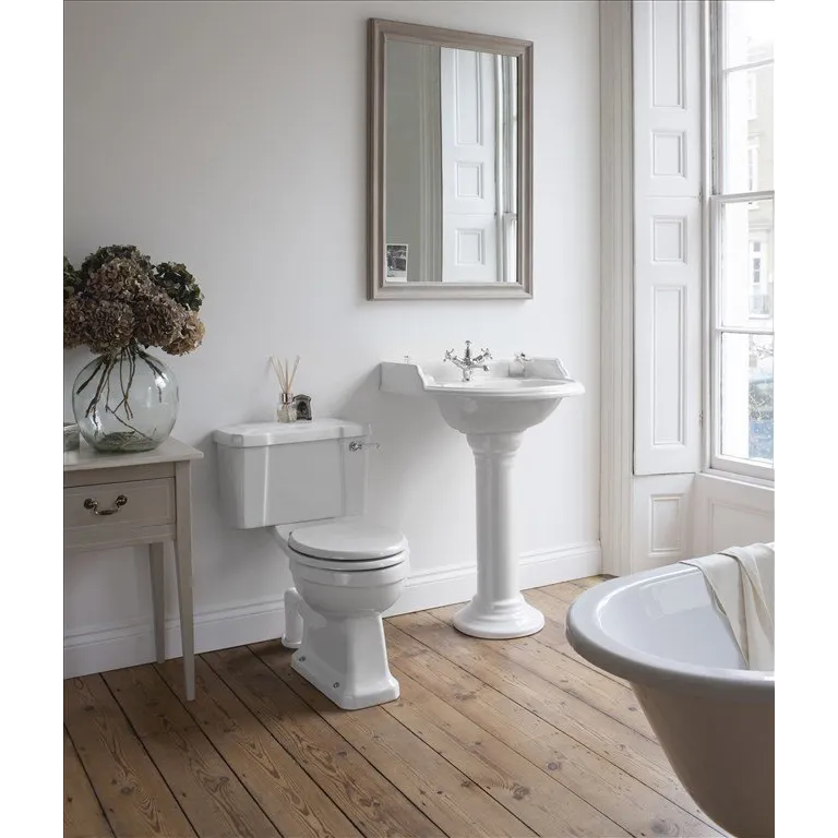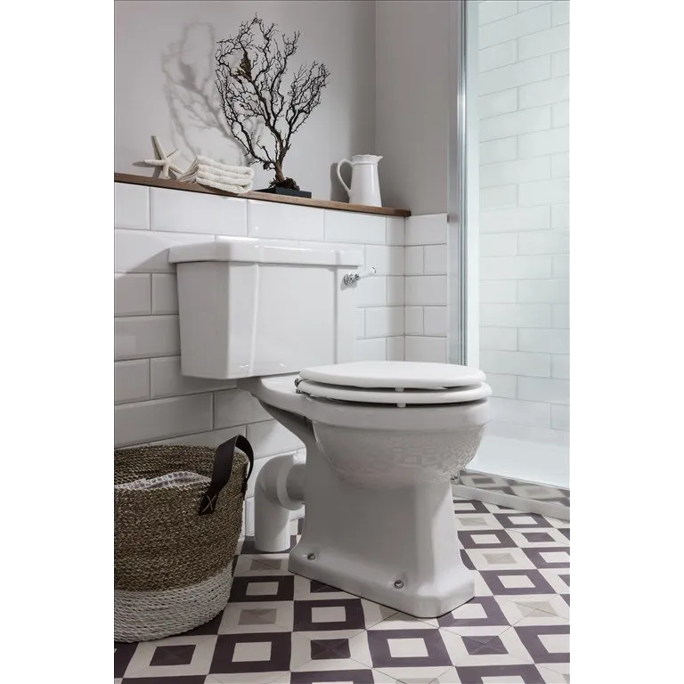 В изысканном интерьере санузла должен быть именно такой унитаз. Его чаша отлично гармонирует со сливным бачком с черной керамической ручкой и хромированной трубой. Бачок украшен изысканными элементами, напоминающими кованые изделия.