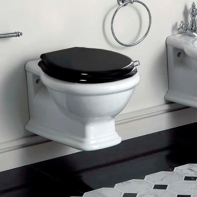 Унитаз выполнен в белом цвете и имеет подвесную установку, что позволяет экономить пространство в ванной комнате.