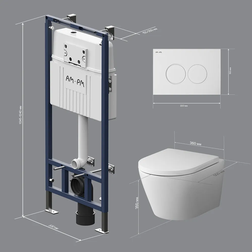 Полностью готовый к установке комплект: система инсталляции с клавишей подвесной унитаз с сиденьем включающий все необходимые крепления патрубки звукоизолирующую прокладку. Экономия пространства благодаря узкому бачку – 120 мм глубиной. Заливной клапан с низким уровнем шума - Класс II согласно европейского стандарта EN 14124.