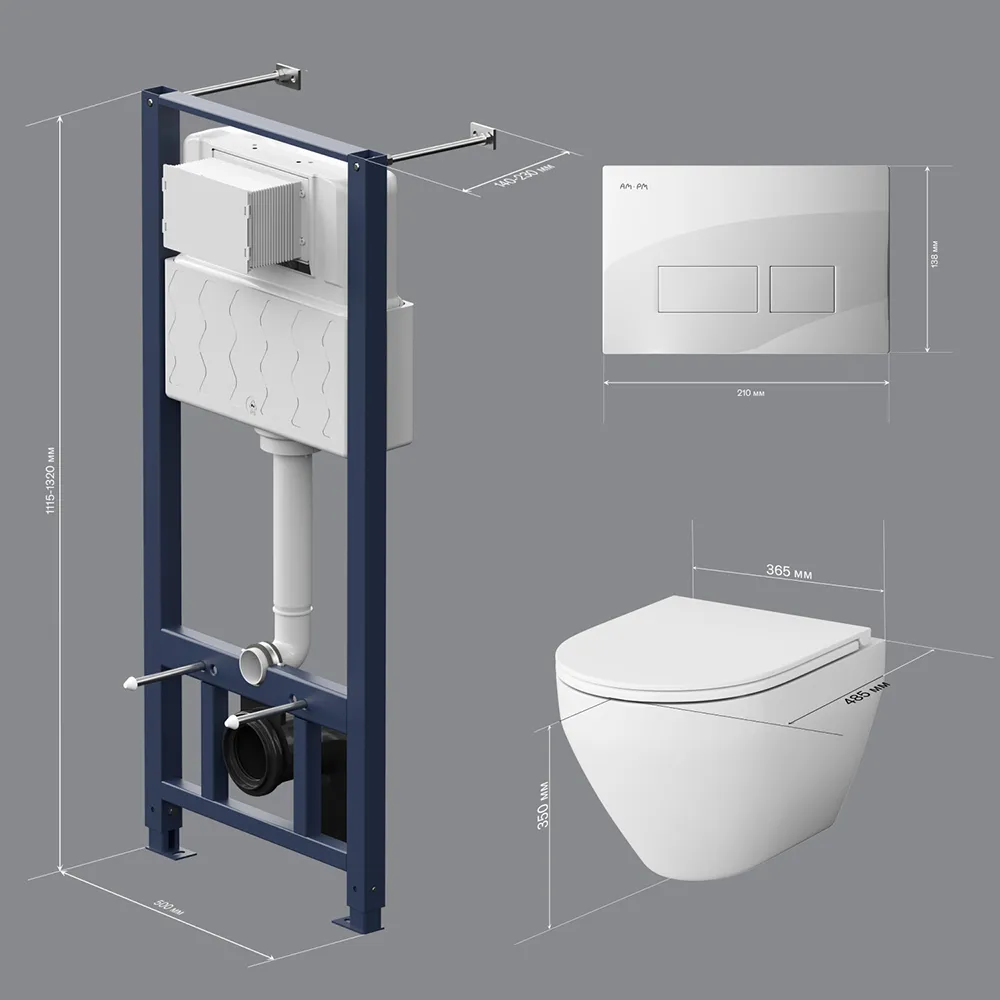 Полностью готовый к установке комплект: система инсталляции с клавишей подвесной унитаз сиденьем.