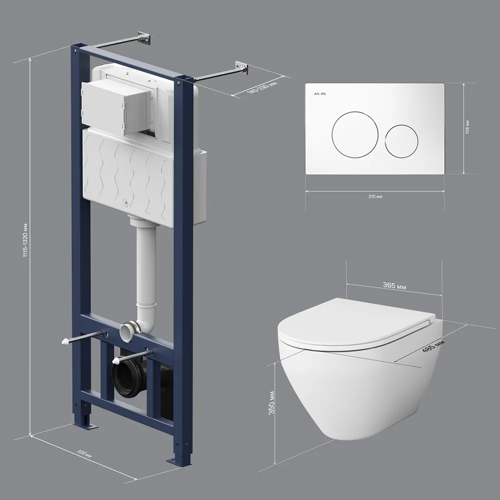 Полностью готовый к установке комплект: система инсталляции с клавишей подвесной унитаз сиденьем.