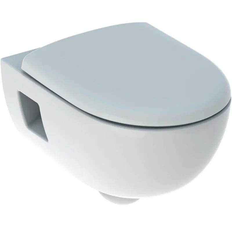 - Подвесной безободковый унитаз Renova полузакрытой формы с открытым крепежом.