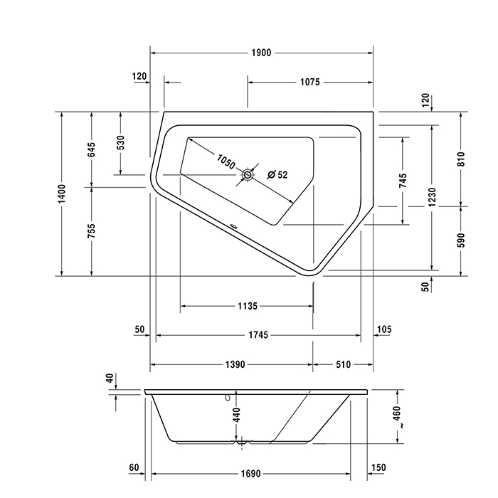 Ванна встраиваемая в правый угол, 190*140*44h, 2 разных наклона спинки, акрил, белая