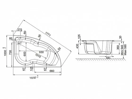 Ванна правосторонняя 170 x 105 см для установки с каркасом.