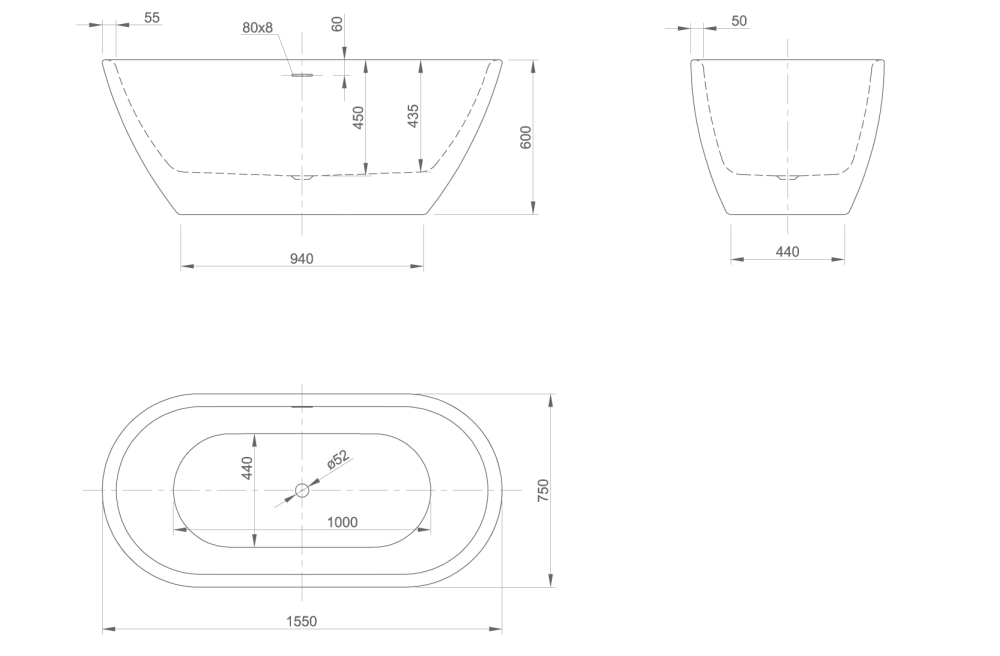 Knief 0100-257 FORM XS Ванна акриловая отдельностоящая 155х75х60H, щелевой перелив, белая глянцевая