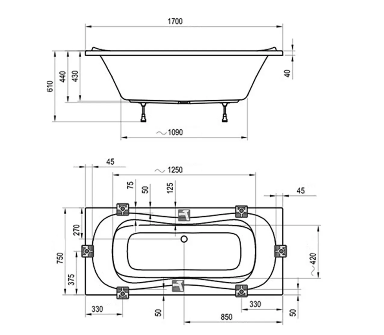 Пример стремления к совершенству – улучшенная ванна Campanula II с прямоугольным профилем и чашей, суженной по центру. Зоны для плеч и коленей стали объемней, ступенчатый рельеф добавил чаше эргономичности и удобства.