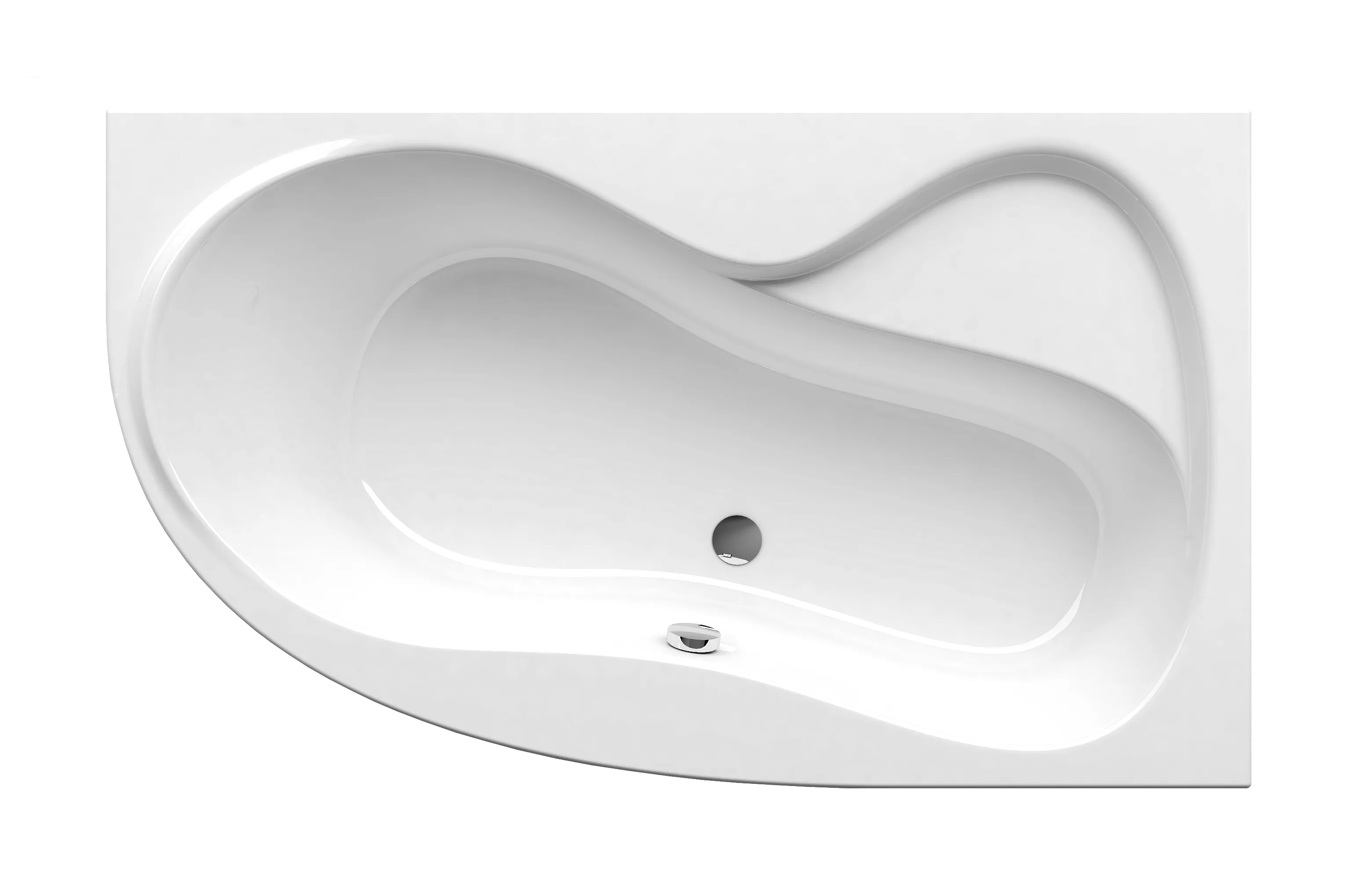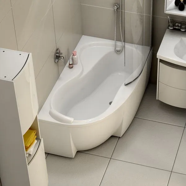 Асимметричная ванна из концепции Rosa отлично подходит для помещений малой площади. Разворот чаши по диагонали увеличивает ее длину и позволяет оставить место для встроенного сиденья. Дно ровное и широкое, сливное отверстие смещено к центру, поэтому принимать душ удобно как сидя, так и стоя.