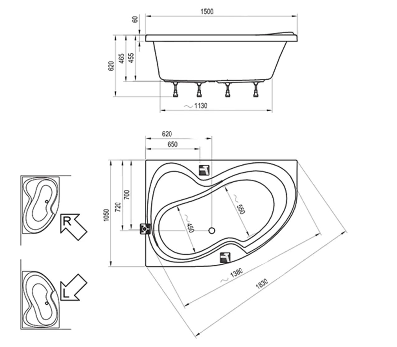 - Габариты: длина 150/160/170 см, ширина 105 см, объем 210/235/260 л