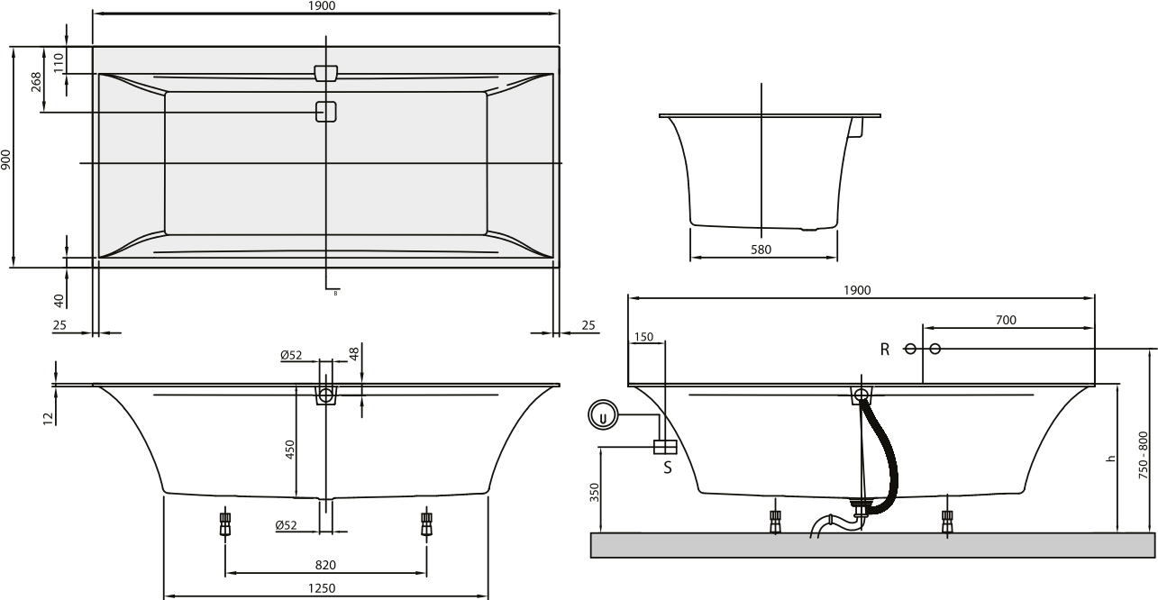 Встраиваемая ванна Villeroy & Boch SQUARO EDGE 12 Quaryl®. Размер: 190X90 см Входит в объем поставки: Duo Литраж, включая 1 человека: 240 С удлиненным комплектом слив/перелив (хромированным + белым)., Для ванн в цвете star white (ярко-белый) (96) мы рекомендуем использовать хромированный комплект слива и перелива., Комплект ножек для ванны (самоклеящихся) входит в поставку, регулируются от 130 - 180 мм. Диаметр: 52 mm