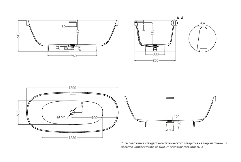 Размеры ванны, увеличенная глубина 48 см и интегрированный слив-перелив, расположенный по центру, дают возможность с комфортом принимать ванну вдвоём.
